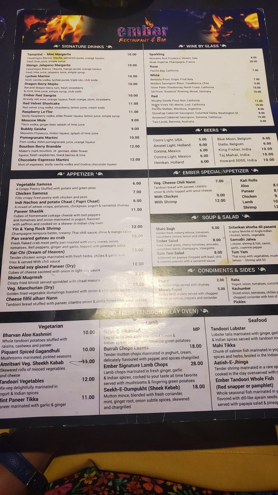 The ambiance exudes class, enhanced by light Indian classical music and stunning murals that create an inviting atmosphere, perfect for group gatherings or intimate dinners. The attentive service, highlighted by staff like Bhisnu, ensures a seamless dining experience. With options for on-site parking, delivery, and even a full bar, Ember Restaurant & Bar is not just a place to eat but a destination for delightful culinary exploration.